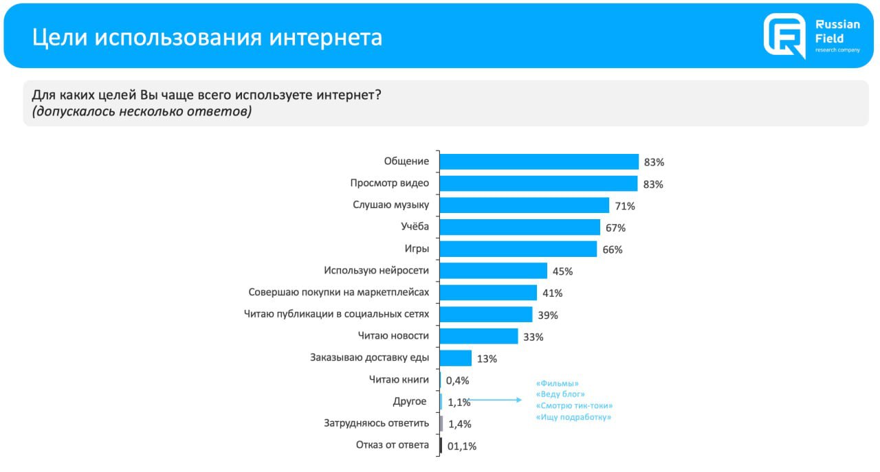 Подростки используют интернет в первую очередь для общения (83%), просмотра видео (83%) и чтобы слушать музыку (71%). Несмотря на бурные дискуссии о нейросетях, они занимают лишь шестую строчку в общем рейтинге целей (45%) и не вытесняют базовые мотивы.
