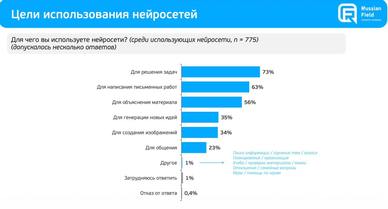 Продолжаю исследовать результаты опроса, который мы провели вместе с Russian Field в начале марта среди подростков 14-17 лет. В прошлых частях я писал о 5 моделях поведения детей в цифровой среде и о целях использования интернета, в этой разберу отношение детей к нейросетям.