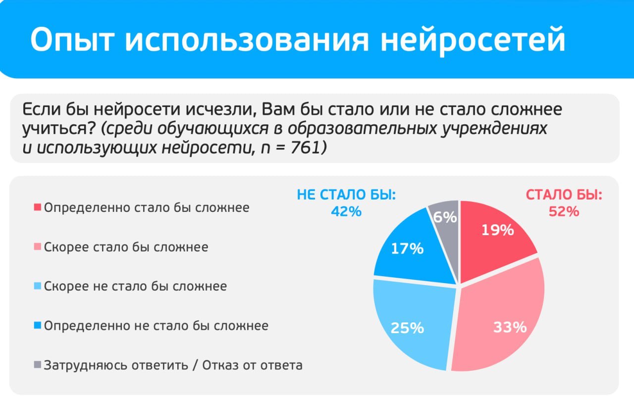 Отдельный вопрос был про зависимость от нейросетей в учёбе. Больше половины подростков (52%) говорят, что без ИИ им стало бы сложнее учиться. Это не только про быстроту и удобство, но и про то, что инструмент успел встроиться в учебную рутину.