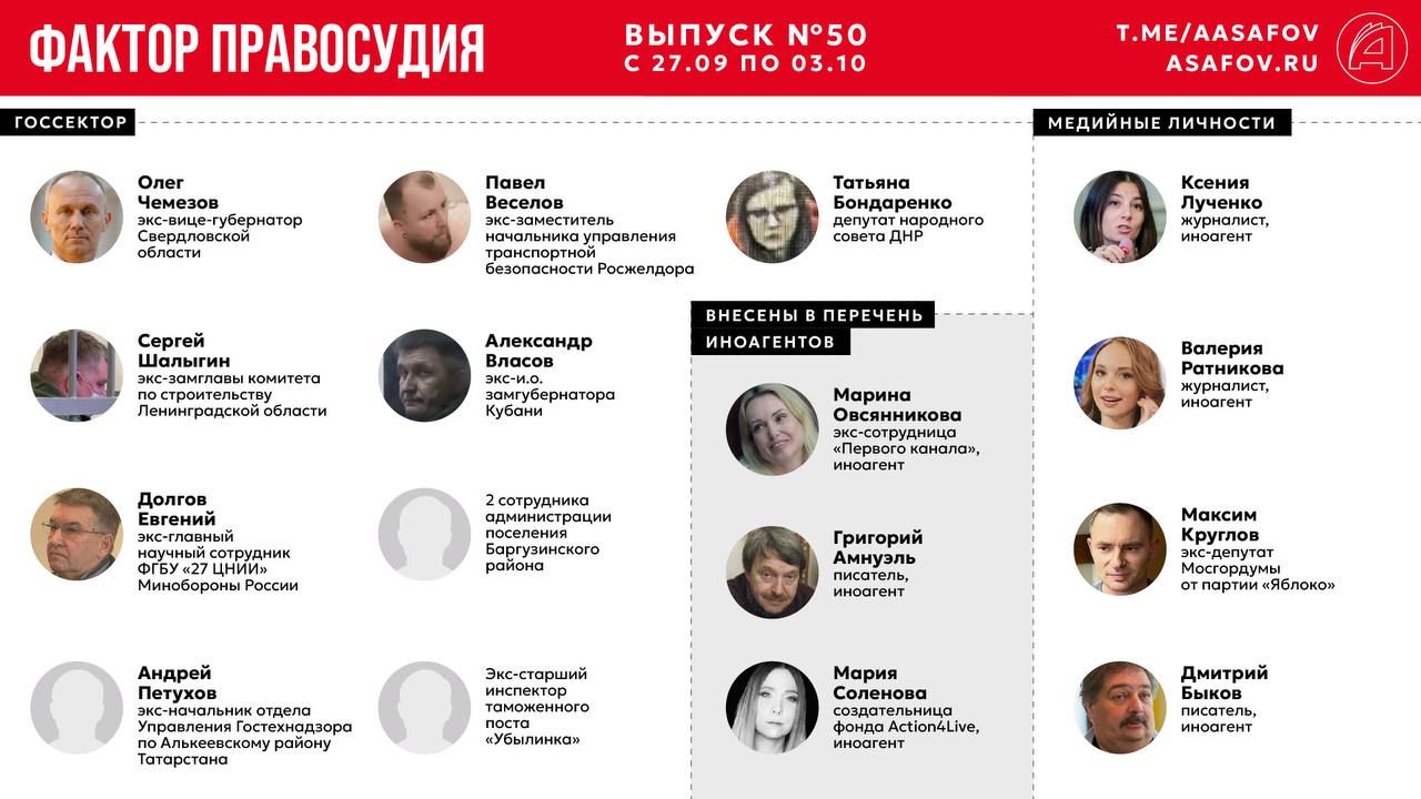 Марина Овсянникова, экс-сотрудница «Первого канала»; Григорий Амнуэль, писатель; Мария Соленова** экс-мундеп р-на Сокол в Москве; сетевой проект «I NEWS».