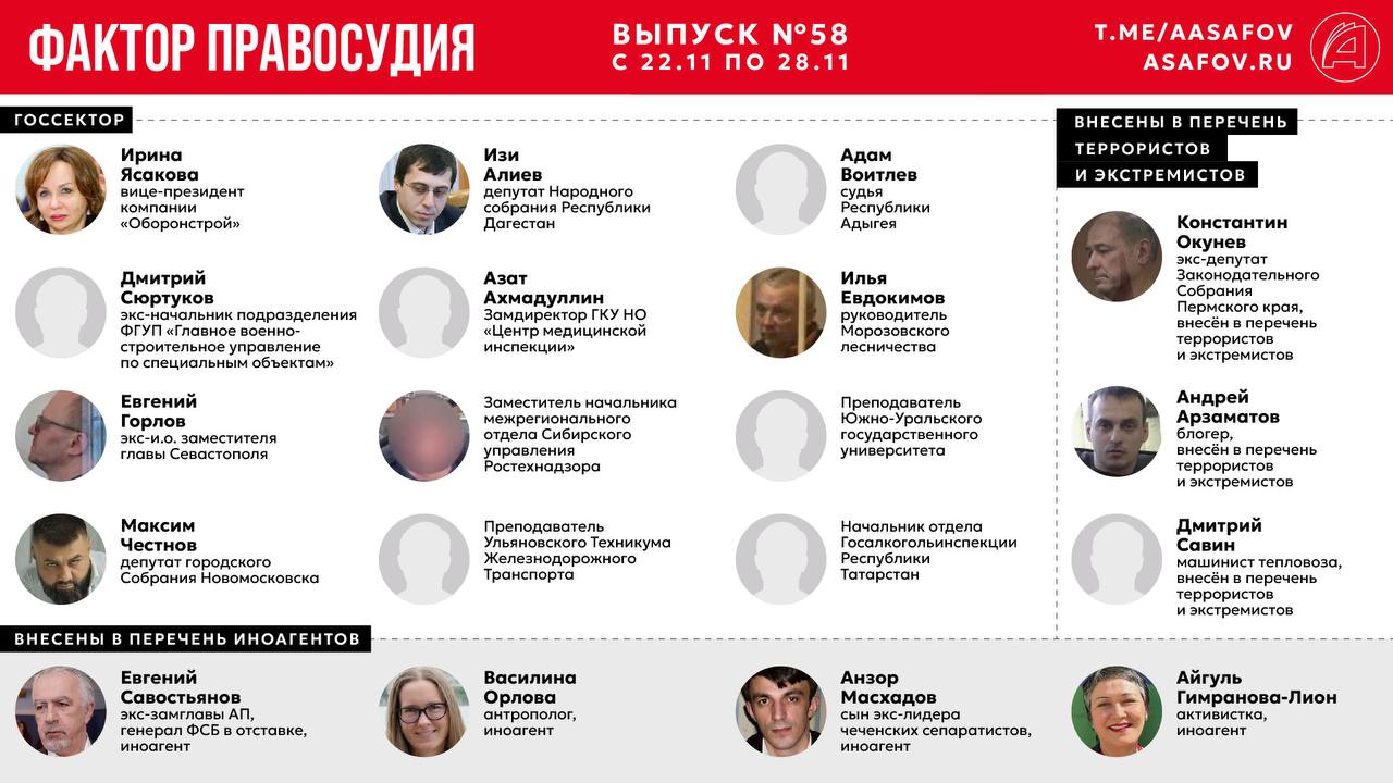 Экс-замглавы АП, генерал ФСБ в отставке Евгений Савостьянов, антрополог Василина Орлова, сын экс-лидера чеченских сепаратистов Анзор Масхадов, активистка Айгуль Гимранова-Лион.