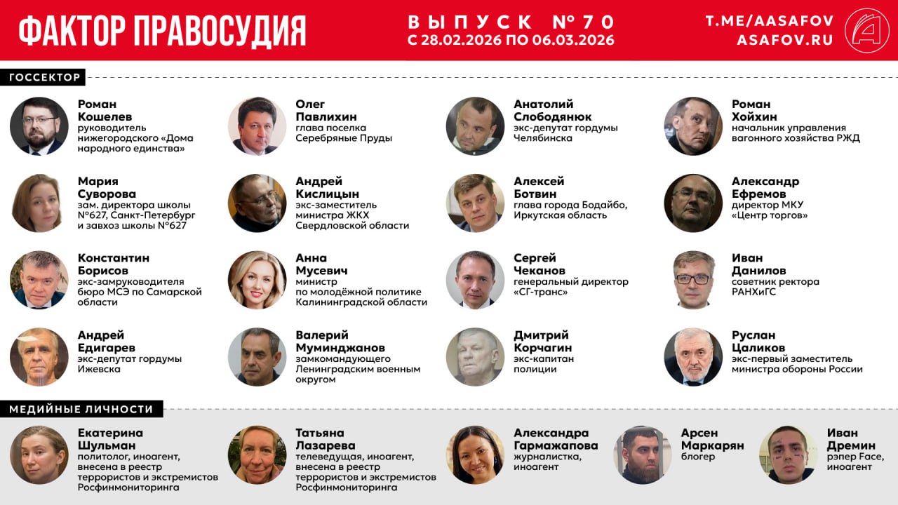За период с 28 февраля по 6 марта 2026 года было выявлено 55 случаев задержаний и судебных процессов (в т.ч. штрафы). Перечень иноагентов не дополнялся.