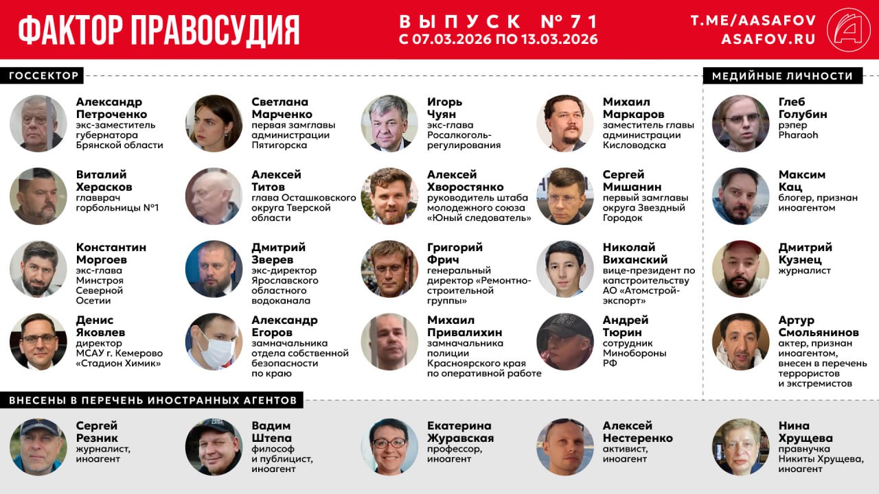 За период с 7 по 13 марта 2026 года было выявлено 56 случаев задержаний и судебных процессов (в т.ч. штрафы). В перечень иноагентов внесли 5 физлиц.