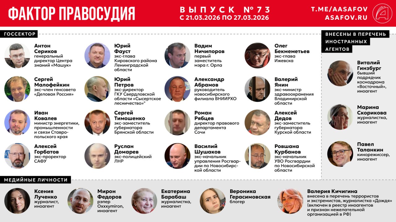 За период с 21 по 27 марта 2026 года было выявлено 84 случая задержаний и судебных процессов (в т.ч. штрафы). В перечень иноагентов внесли 3 физлица.