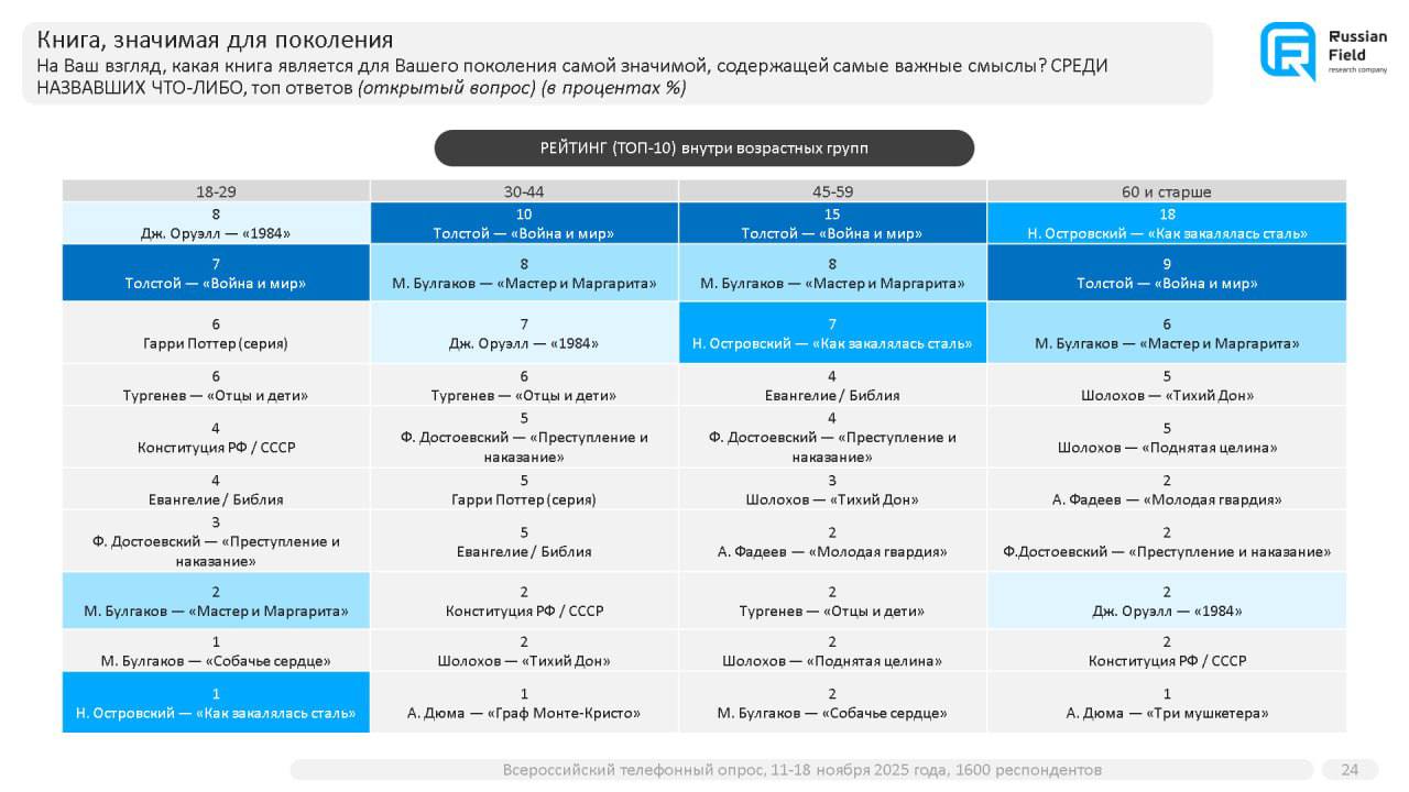 Чтобы развеять сомнения и проверить множество отличающихся версий, мы с Russian Field провели исследование на тему самой значимой книги для каждого поколения по репрезентативной выборке. Удивительными открытиями стало то, что мы поколение не только Гимна России и Виктора Цоя, но и Льва Толстого и Михаила Булгакова.
