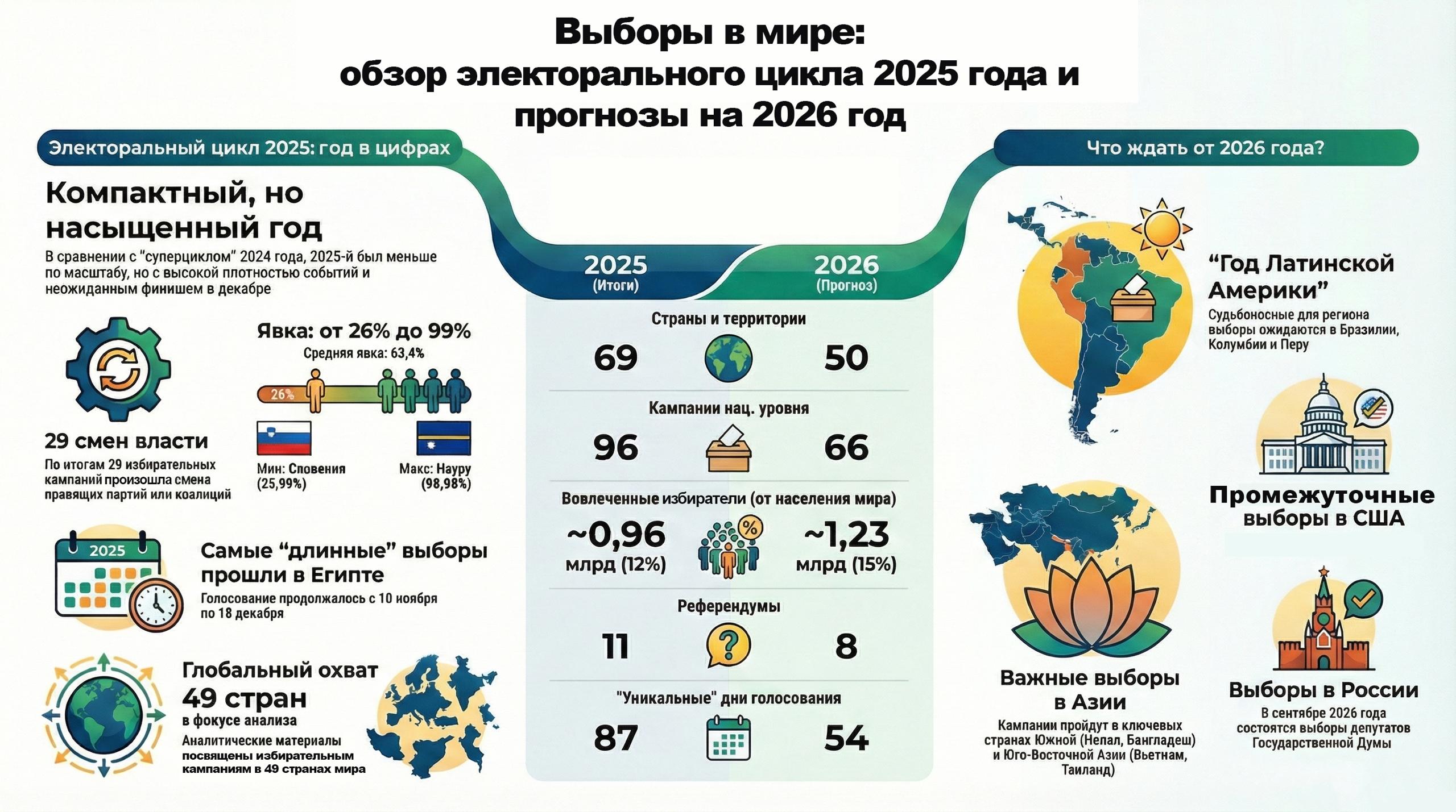 В сравнении с электоральным "суперциклом" 2024 года уходящий 2025 год оказался заметно более компактным по масштабу и количеству избирательных кампаний, но при этом сохранил высокую плотность событий в отдельные пиковые месяцы, включая необычно насыщенный декабрьский финиш, и принес немало сюрпризов странам Азии, Африки, Европы и Латинской Америки.