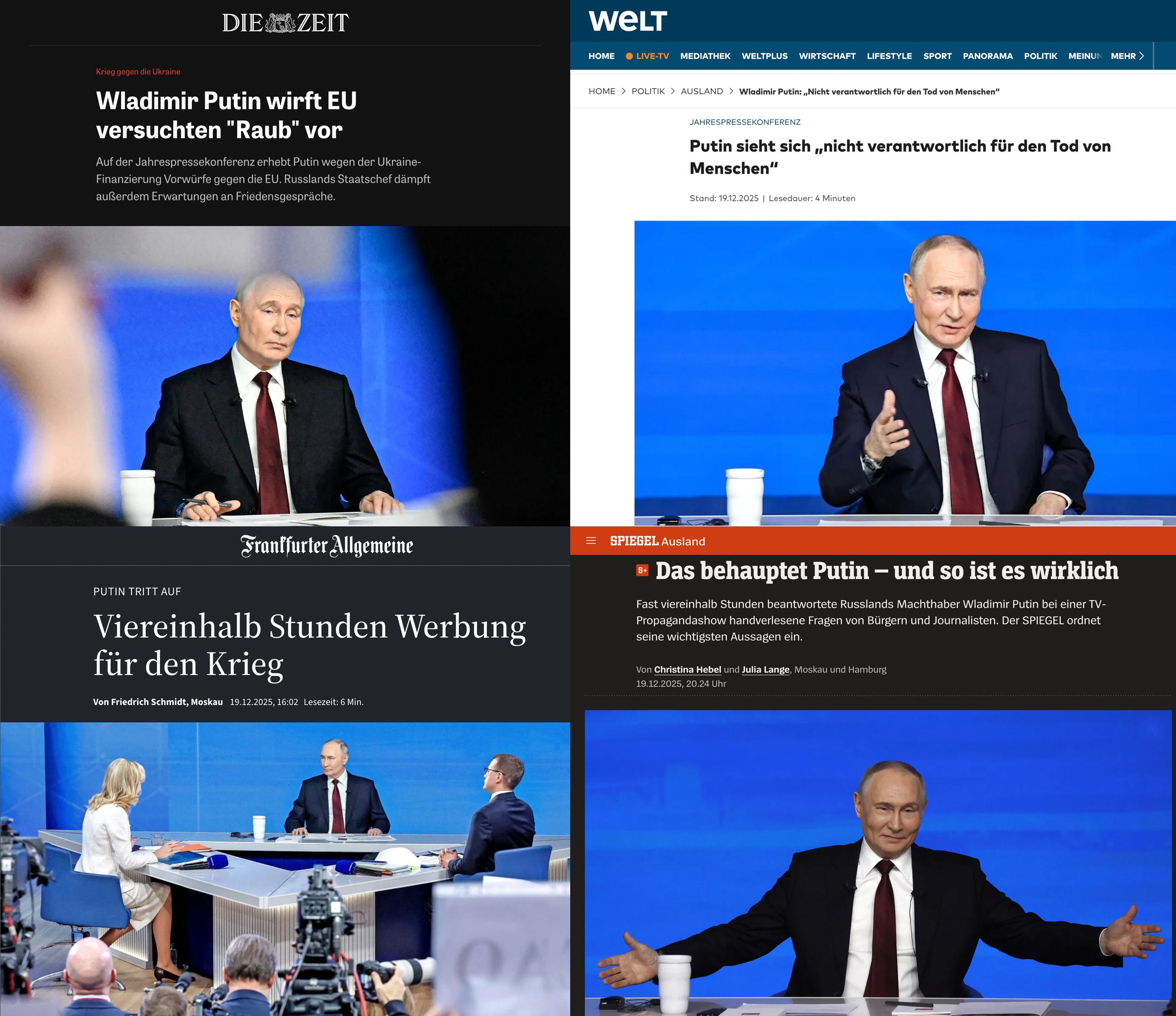 Der Spiegel: Так утверждает Путин – и это действительно так: почти четыре с половиной часа российский лидер отвечал на тщательно отобранные вопросы граждан и журналистов в ходе телевизионного пропагандистского шоу.