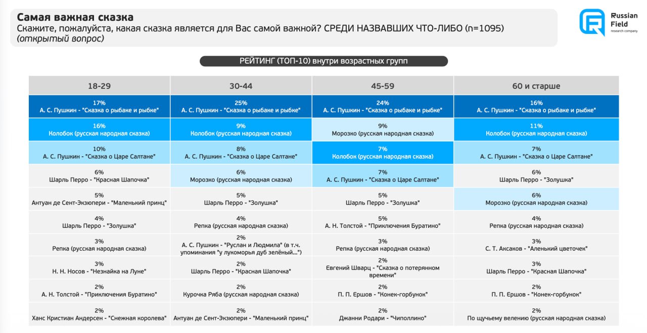 В прошлых постах я публиковал результаты исследований о самых важных книгах лично для каждого и для поколения. В этих опросах были собраны все жанры и типы книг. В конце января вместе с Russian Field мы провели опрос, который посвящен только сказкам. В нем участвовали 1600 респондентов разного возраста по всей стране.